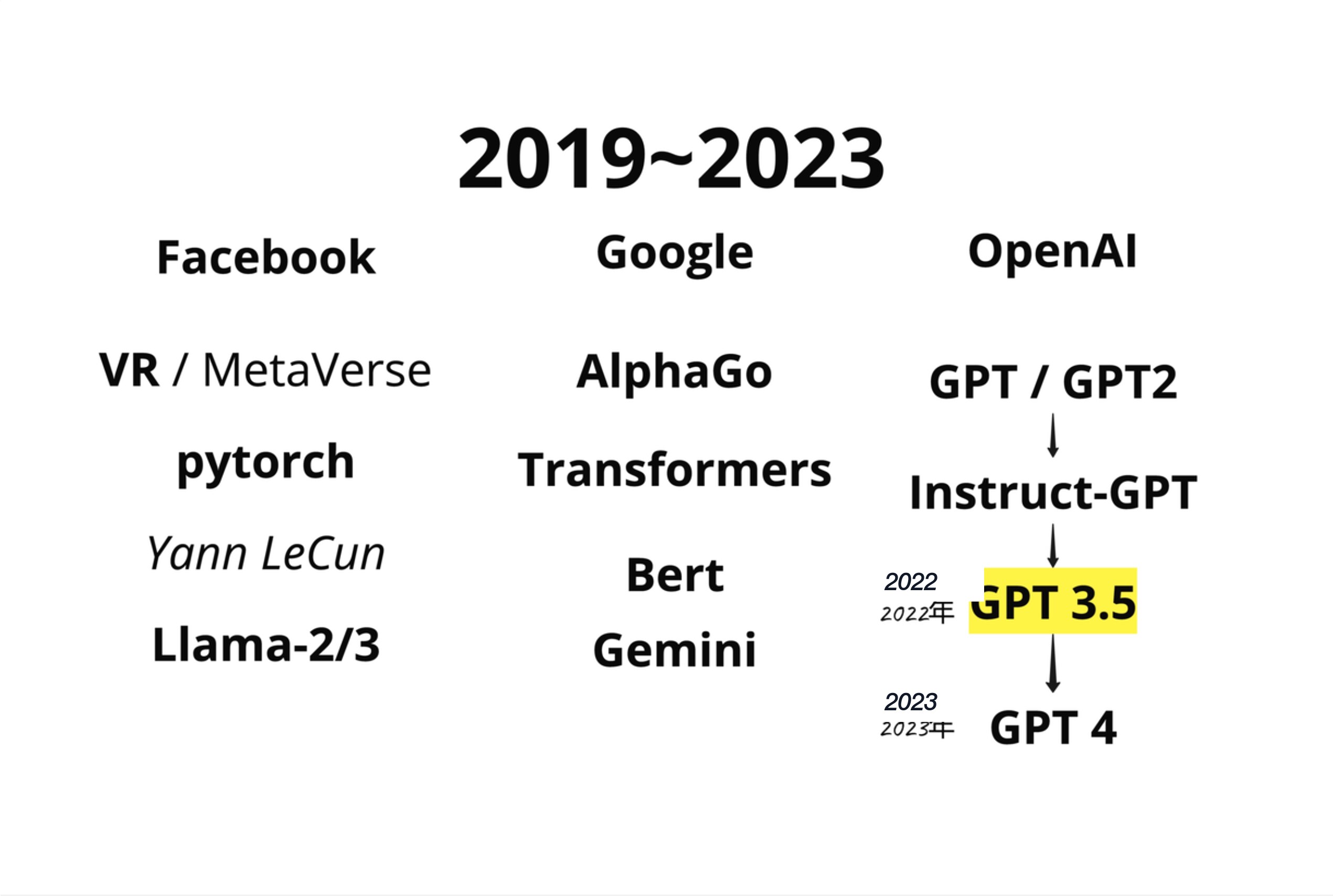 | OpenAI | GPT-2, GPT-3, ChatGPT, GPT-4 | closed product, strongest consumer breakthrough |