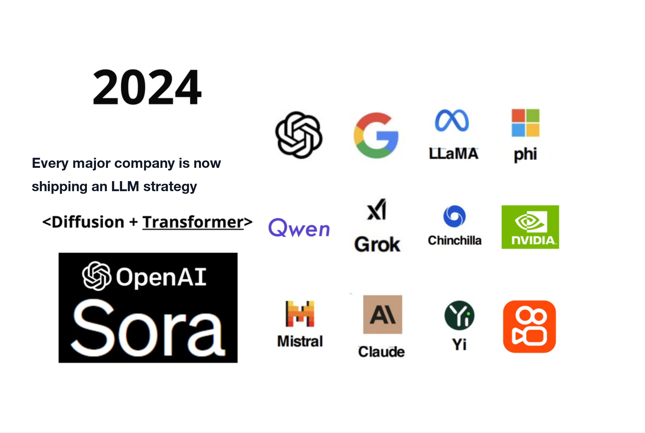 One 2024 pattern is worth naming directly: Diffusion + Transformer. Sora made that direction visible. The exact product details matter less here than the architecture lesson: Transformer-style sequence modeling was no longer only about words; it was becoming part of how models organize video, images, actions, and time.