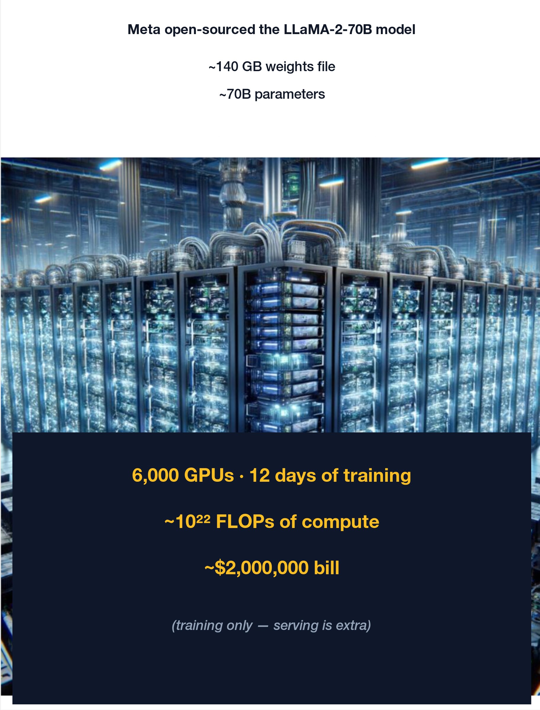 | LLaMA-2-70B training | ~6,000 A100 GPUs, ~12 days, weights ~140 GB |