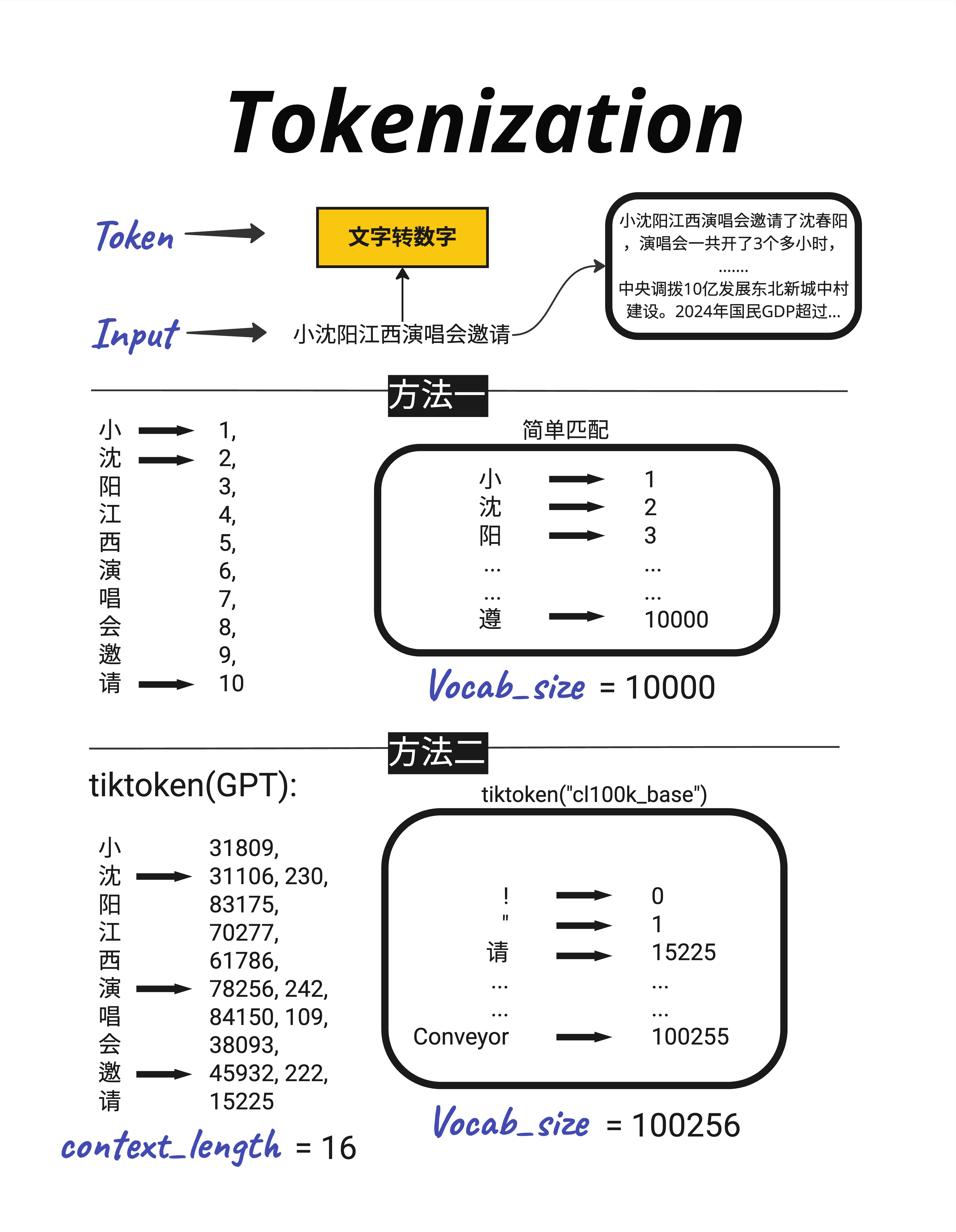 | Tokenization | 分词/编码 | 把文字切分成 token 并转换成数字 |