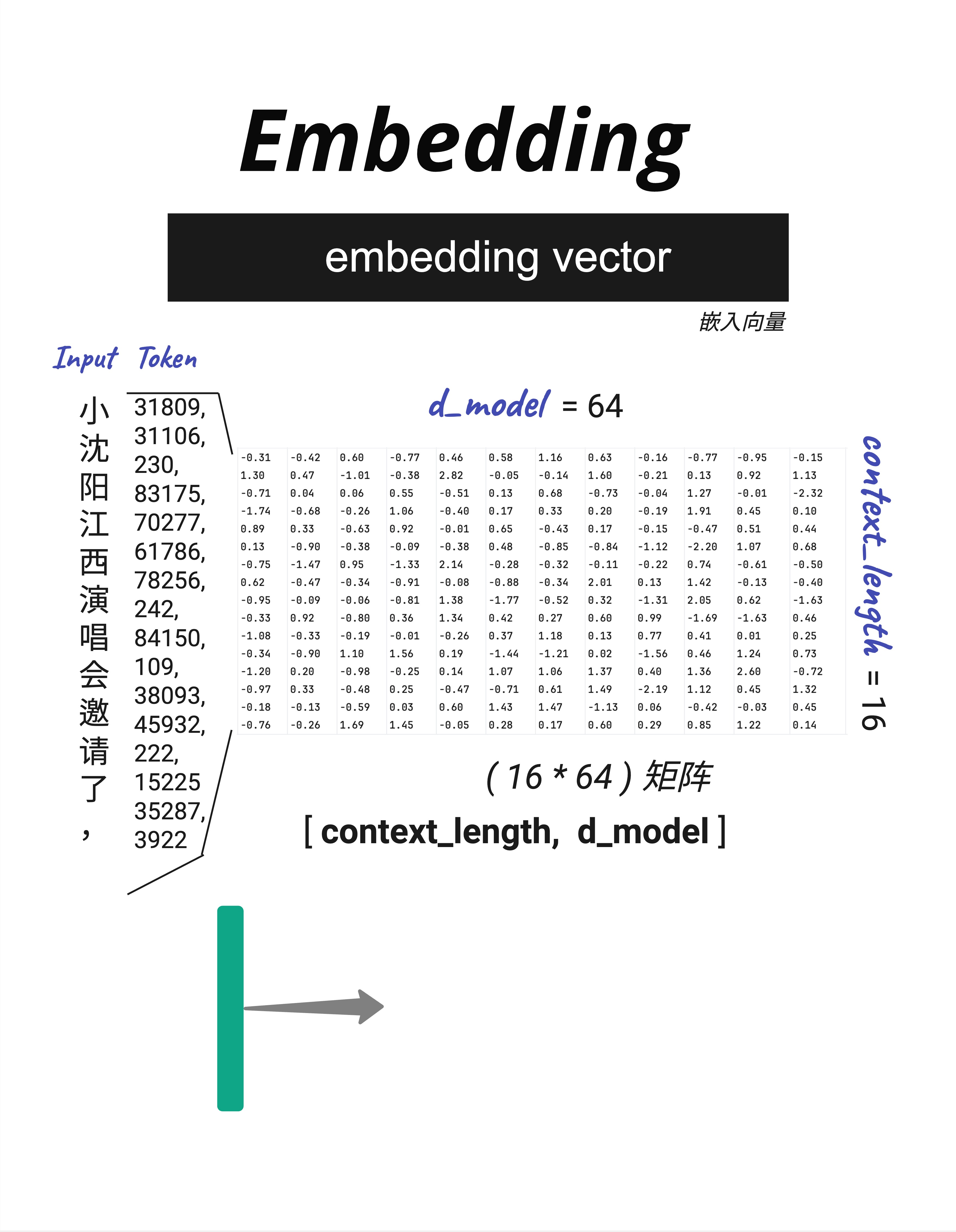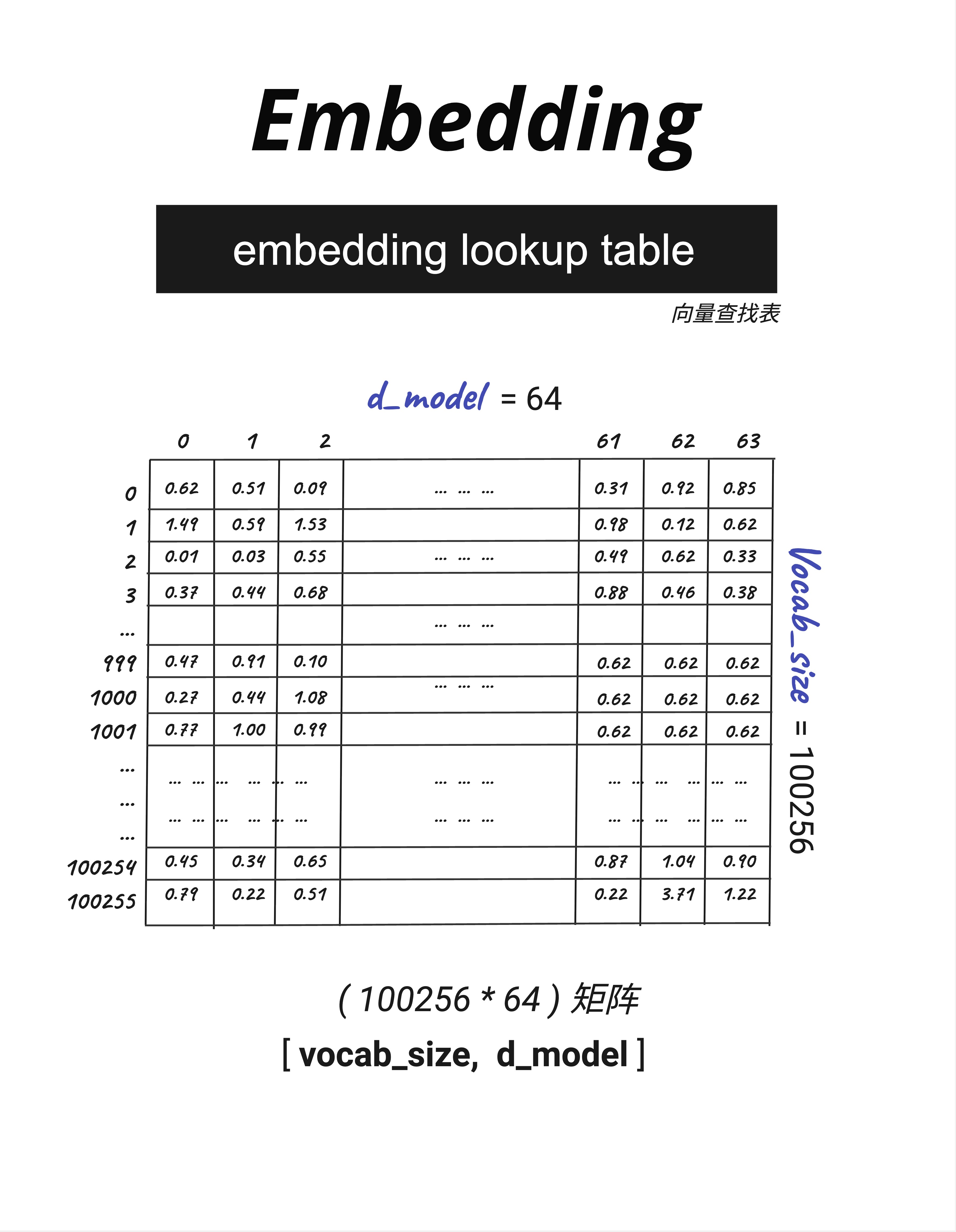 [[0.62, -0.51, ...], # Embedding 矩阵 [context_length, d_model]