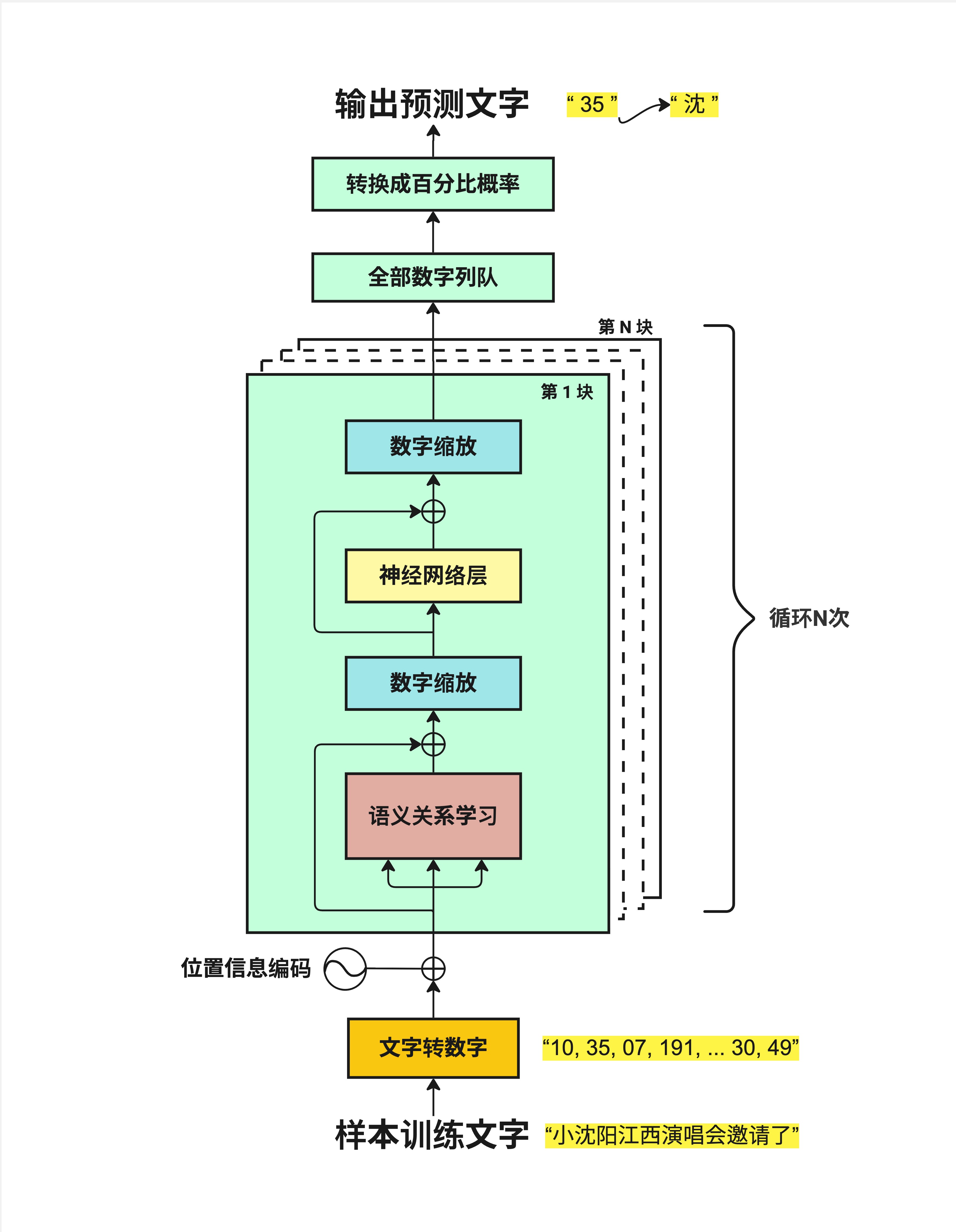 样本训练文字 → 文字转数字 → 位置信息编码 → 语义关系学习 → ...