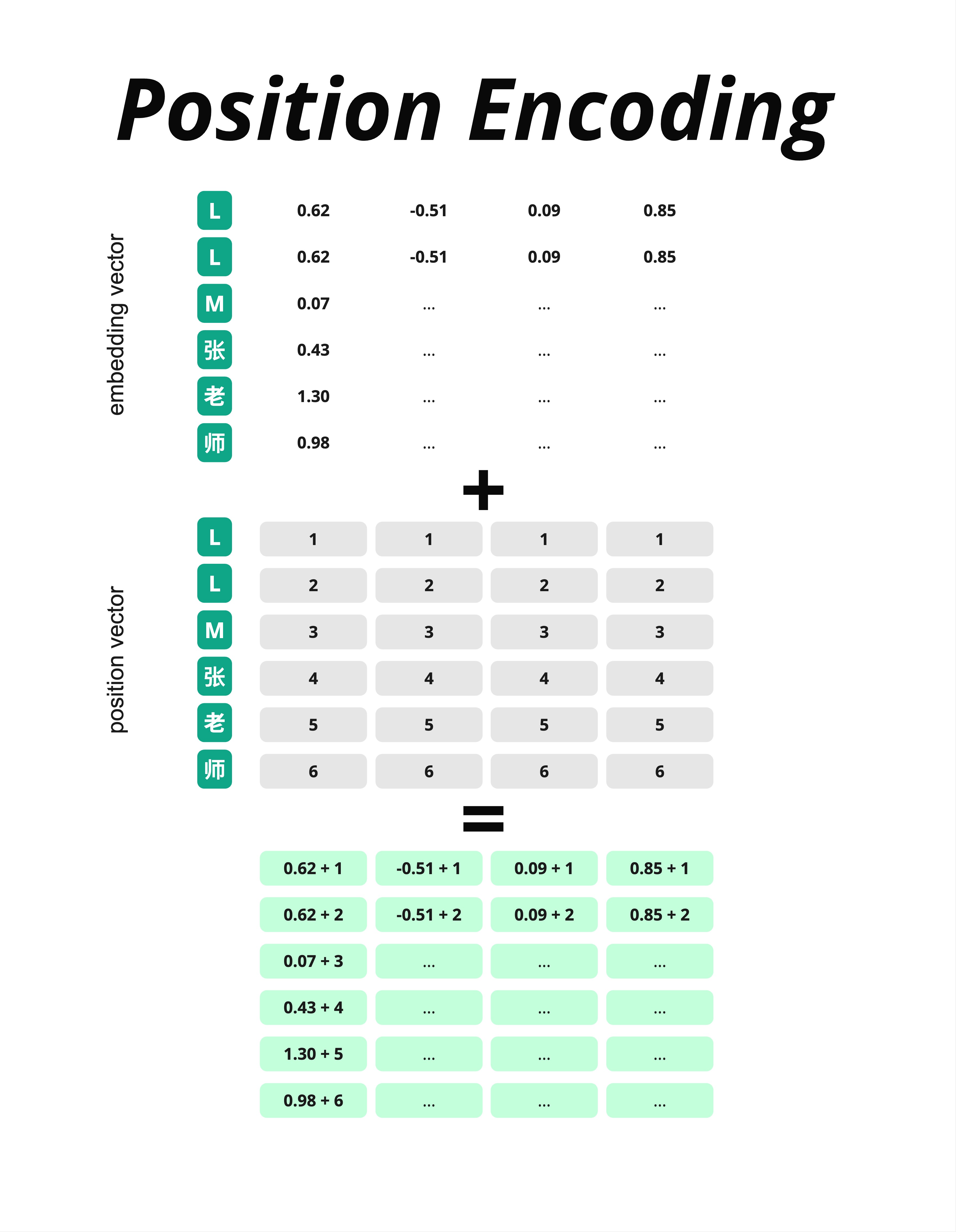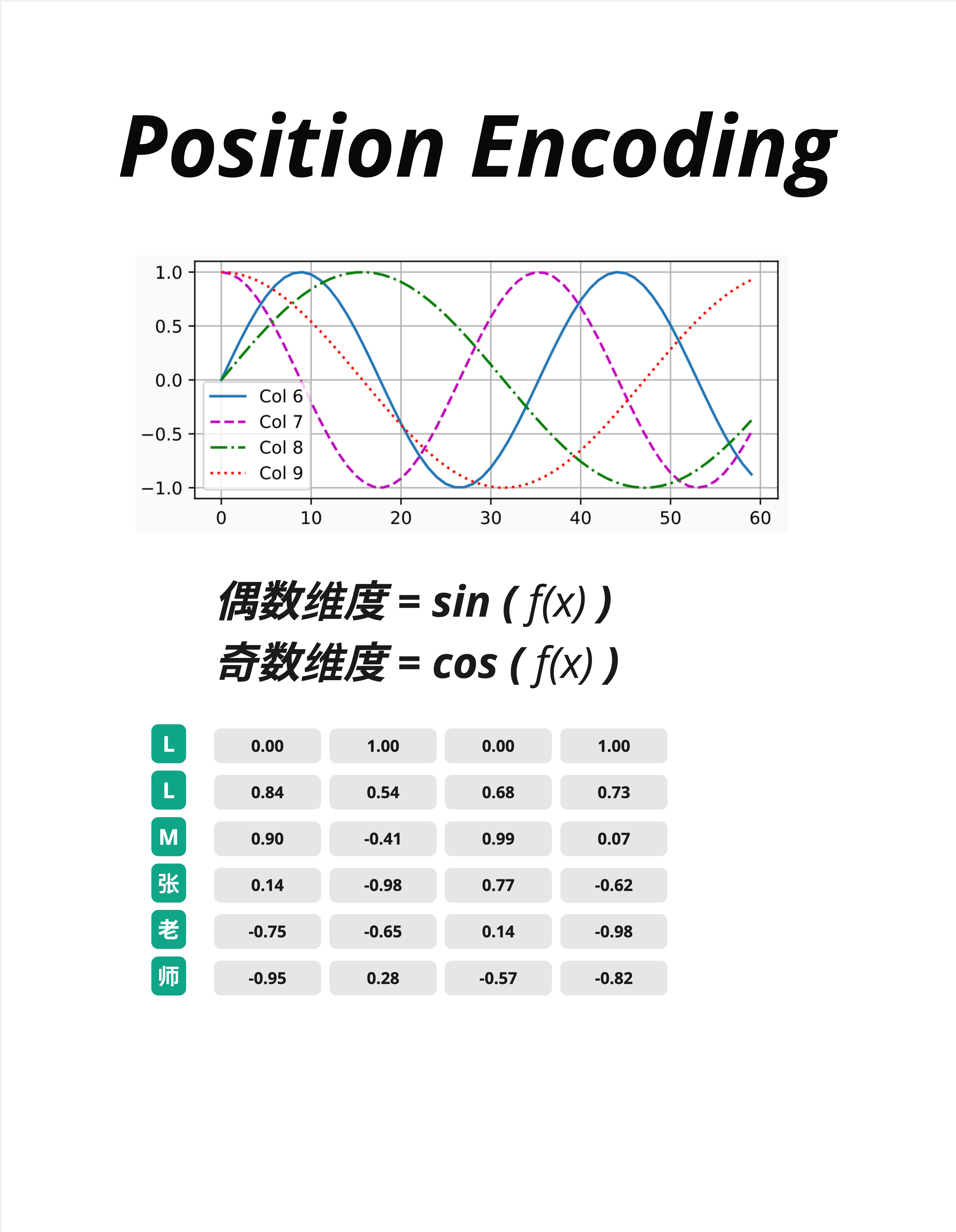 | Positional Encoding | 给每个位置添加独特的向量表示 |