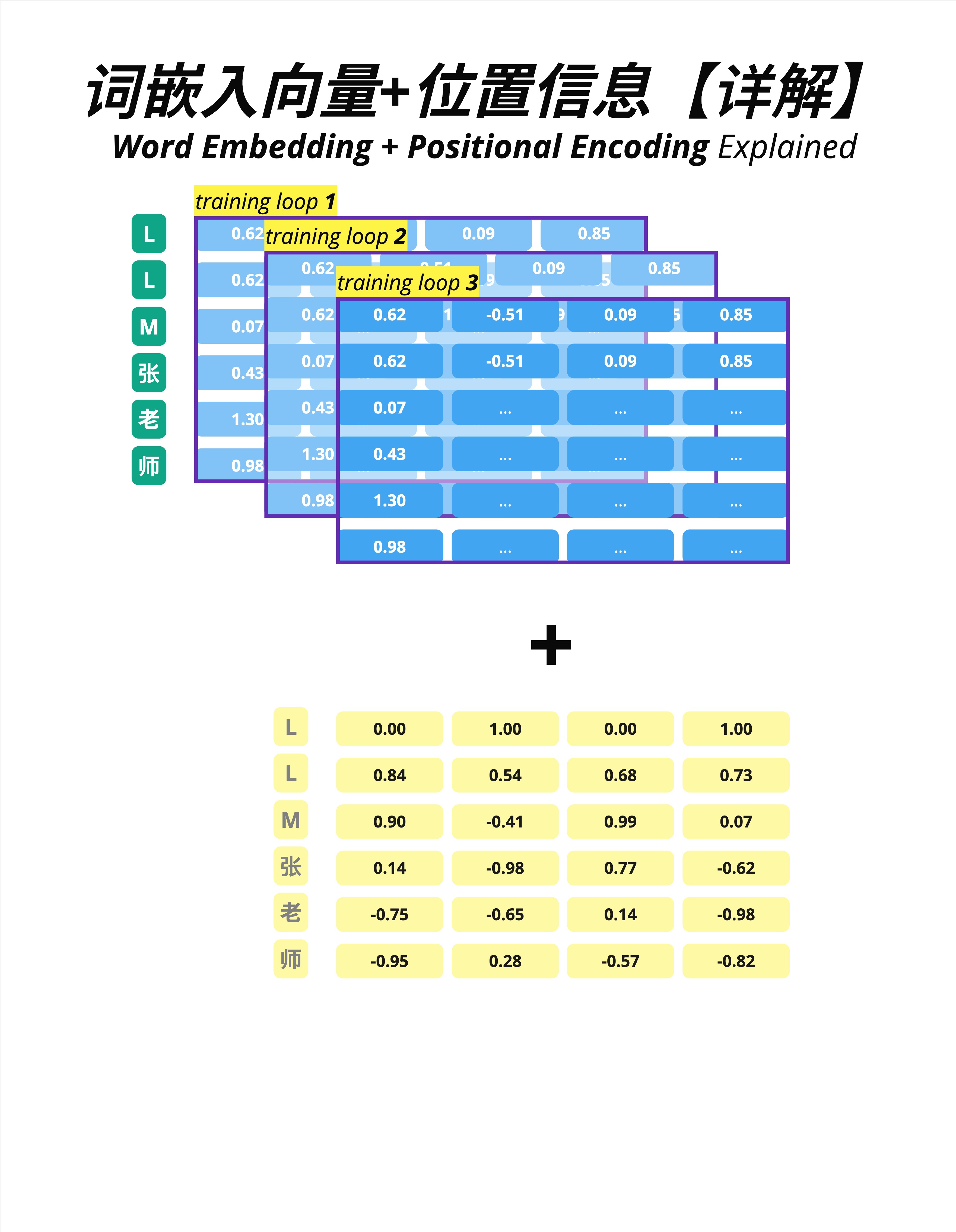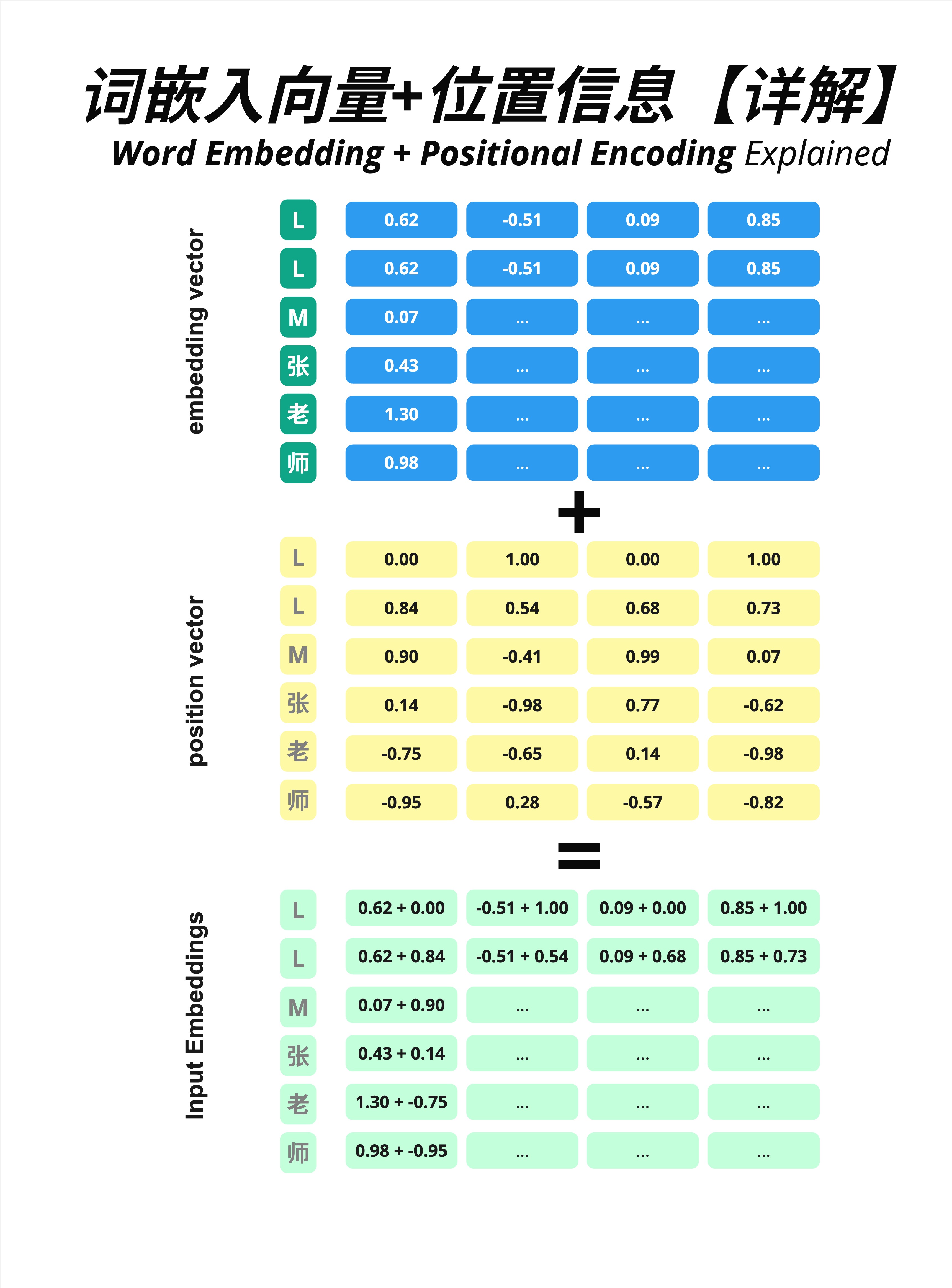 现在让我们看完整的过程:把 Embedding 向量和位置向量加起来。