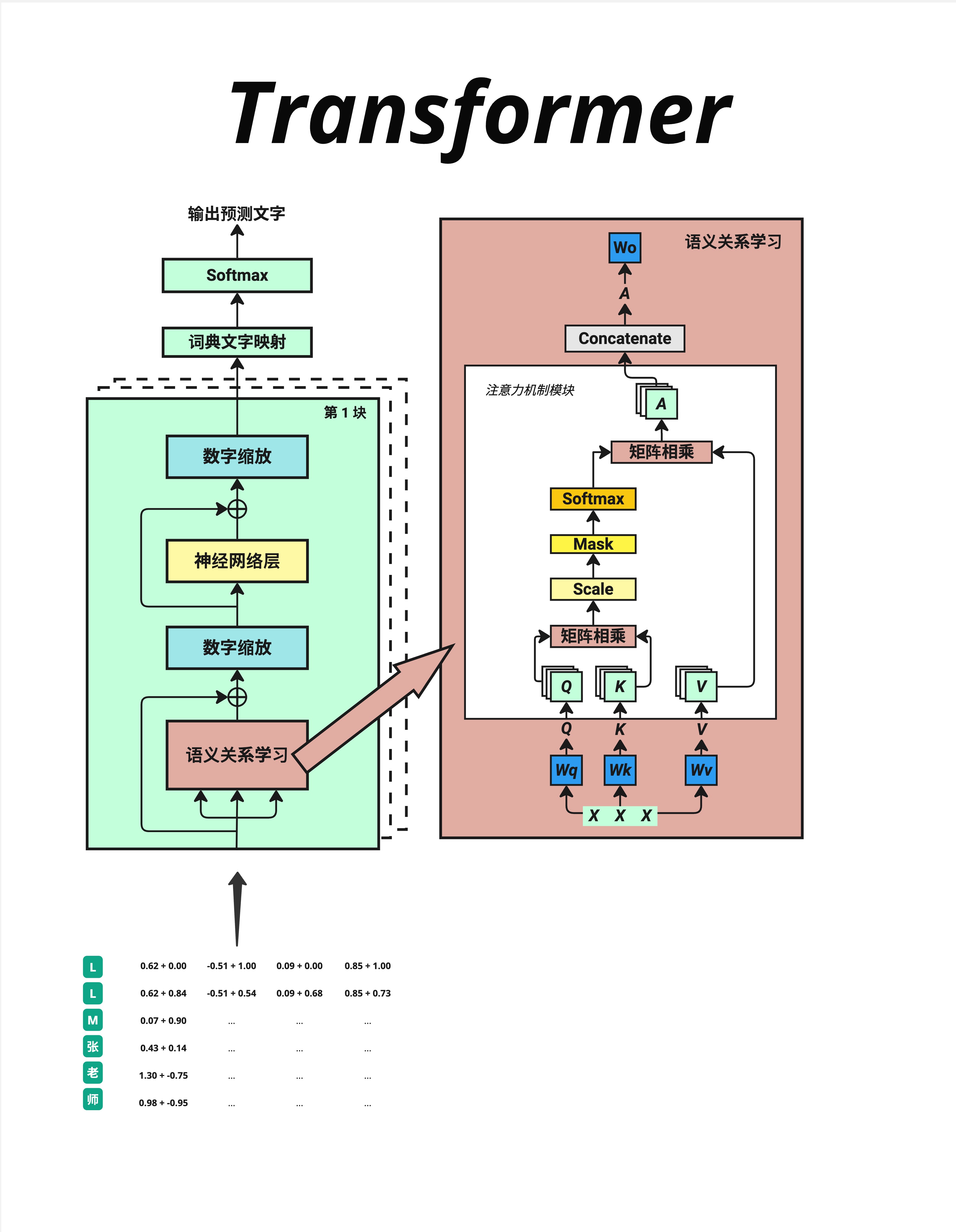 - 输入文字经过 Embedding(文字转数字 → 嵌入向量)