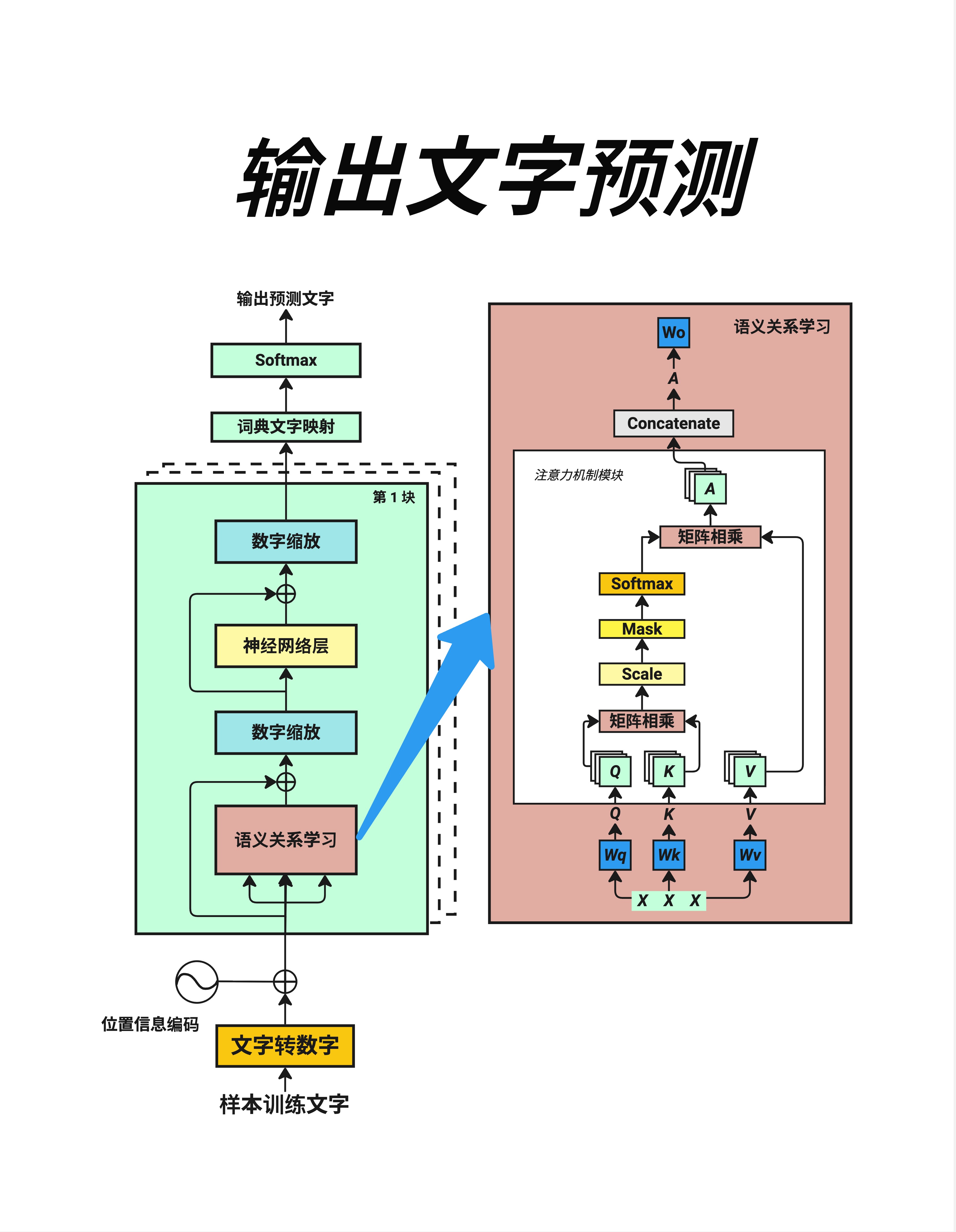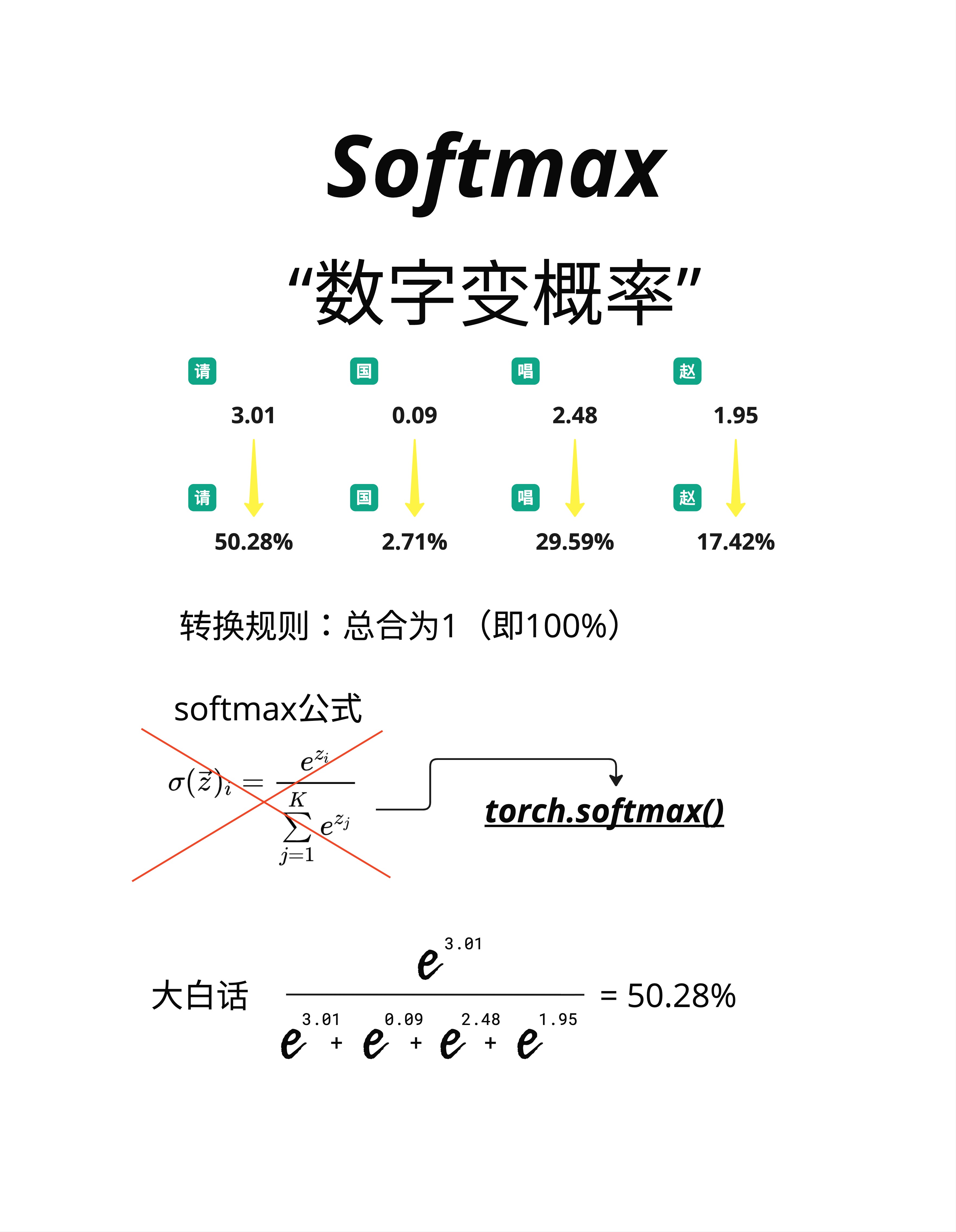 - Softmax:出现在 Attention 计算和最终输出中,负责"数字变概率"
