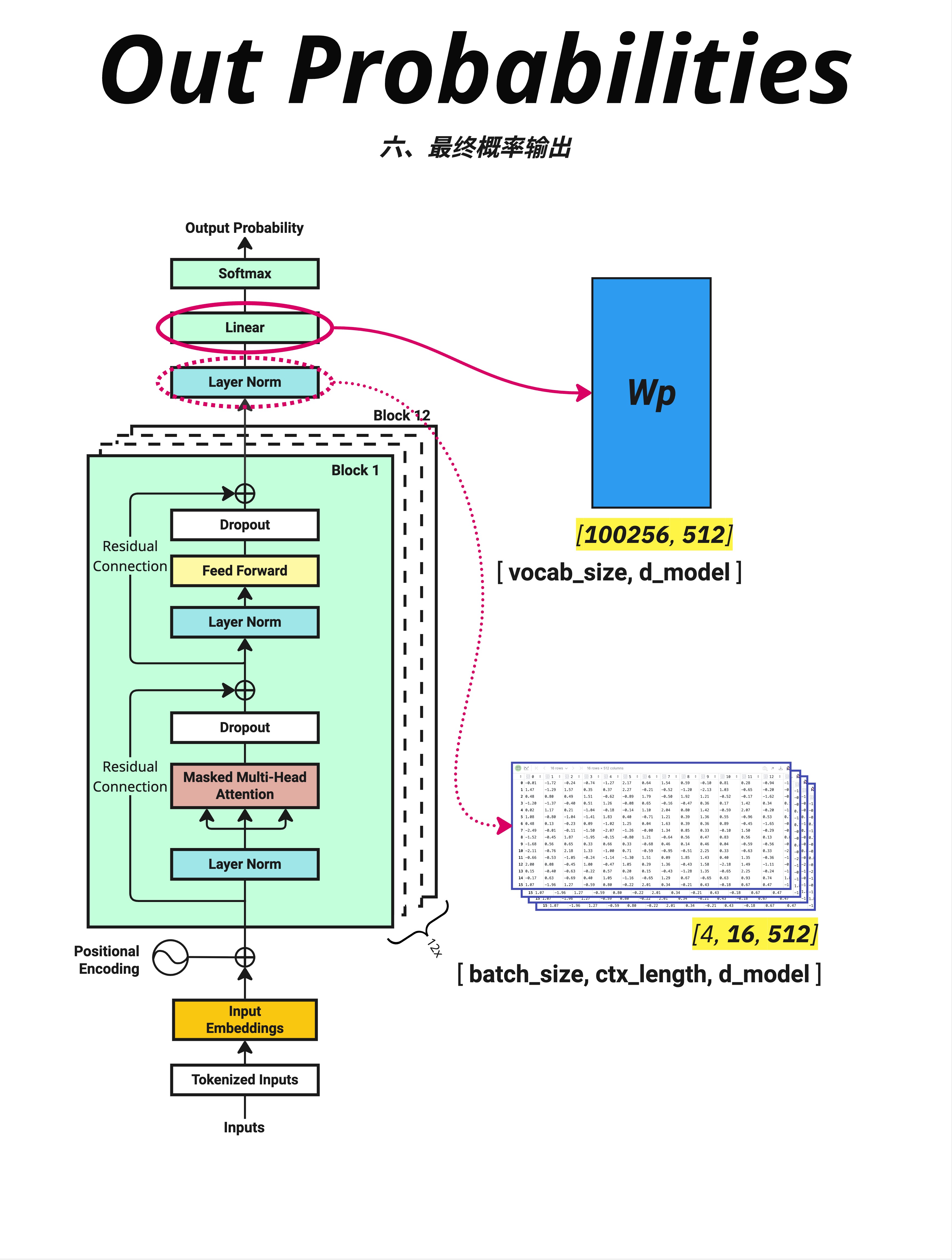 关键步骤:把 512 维向量映射到 100256 维(词表大小)。