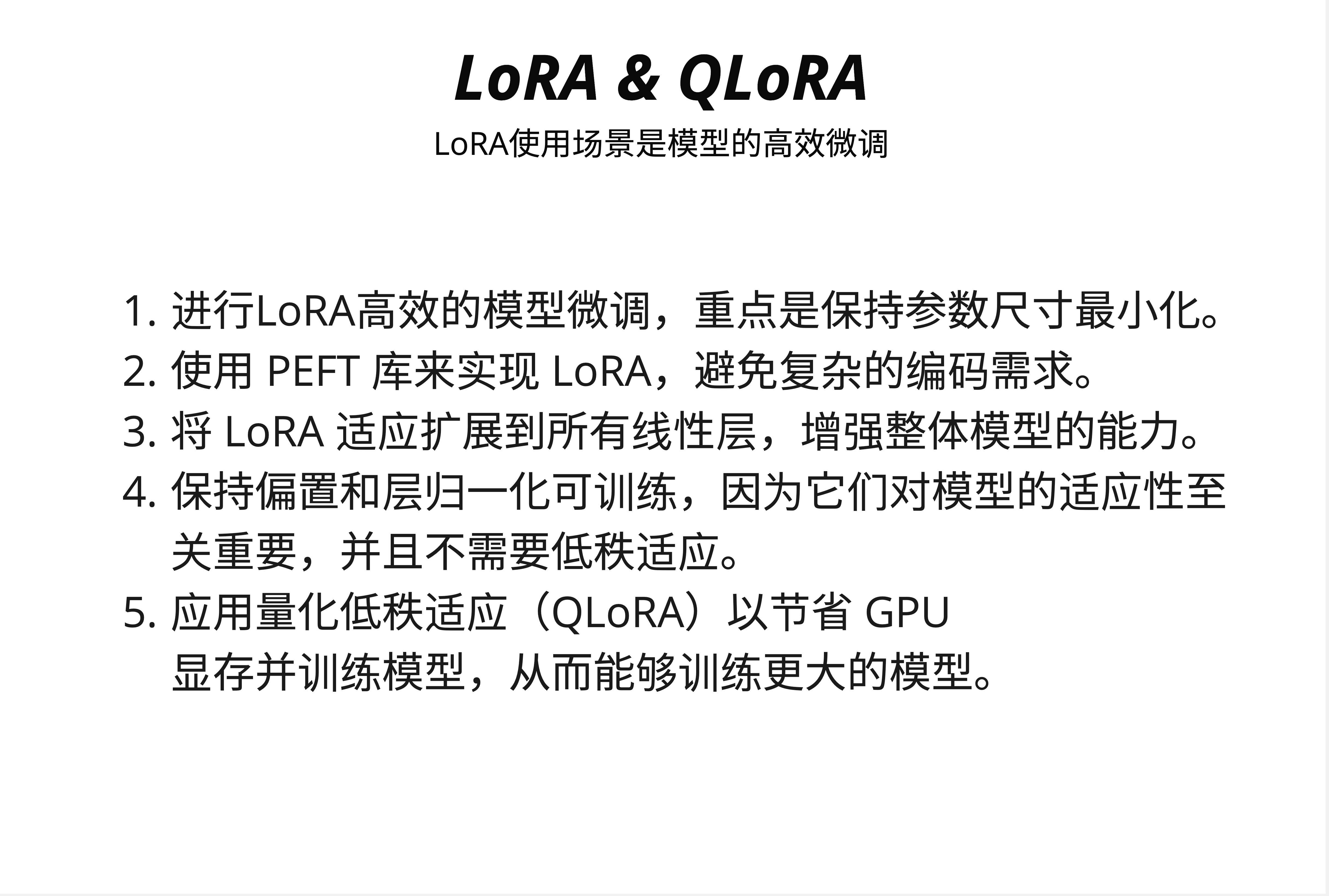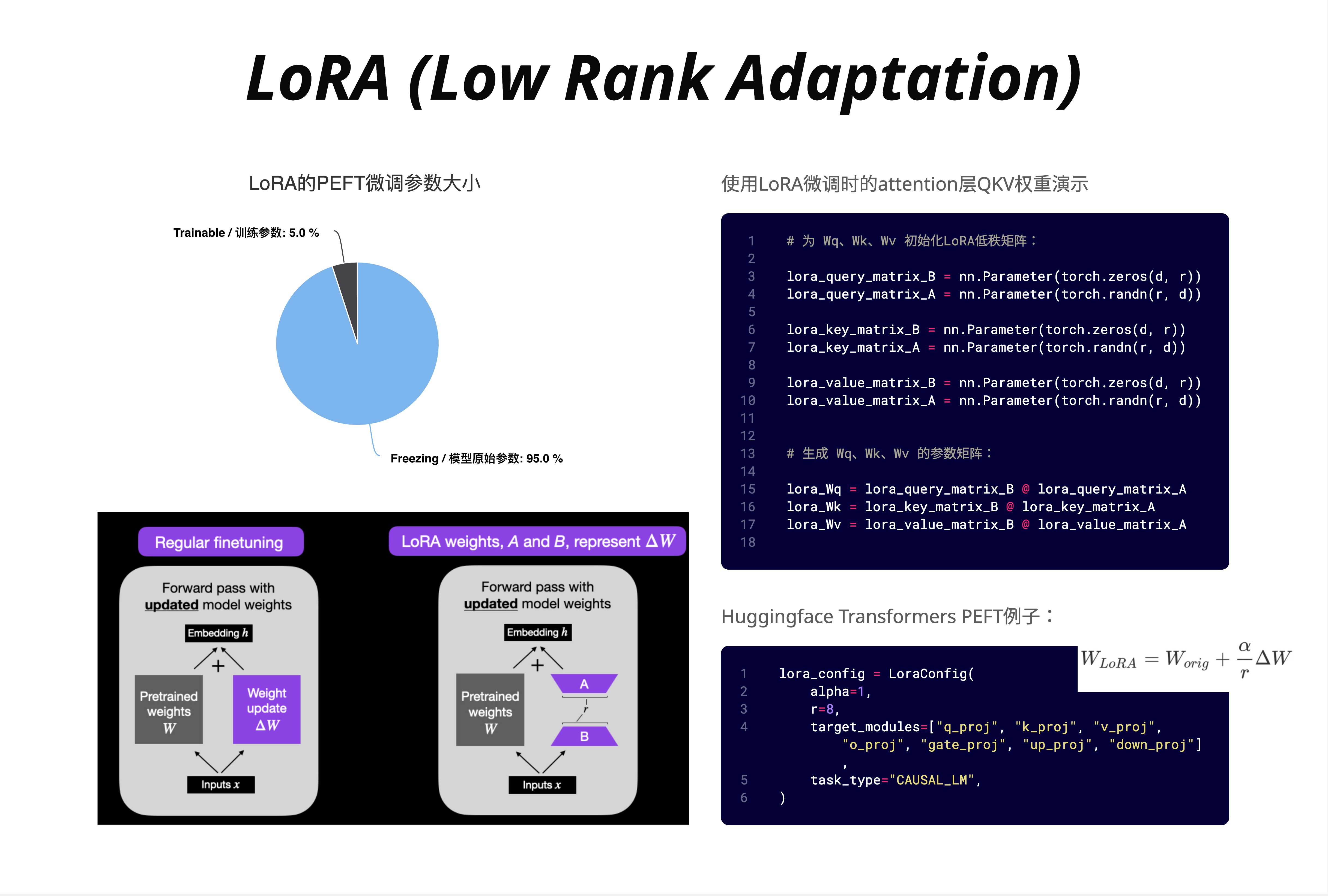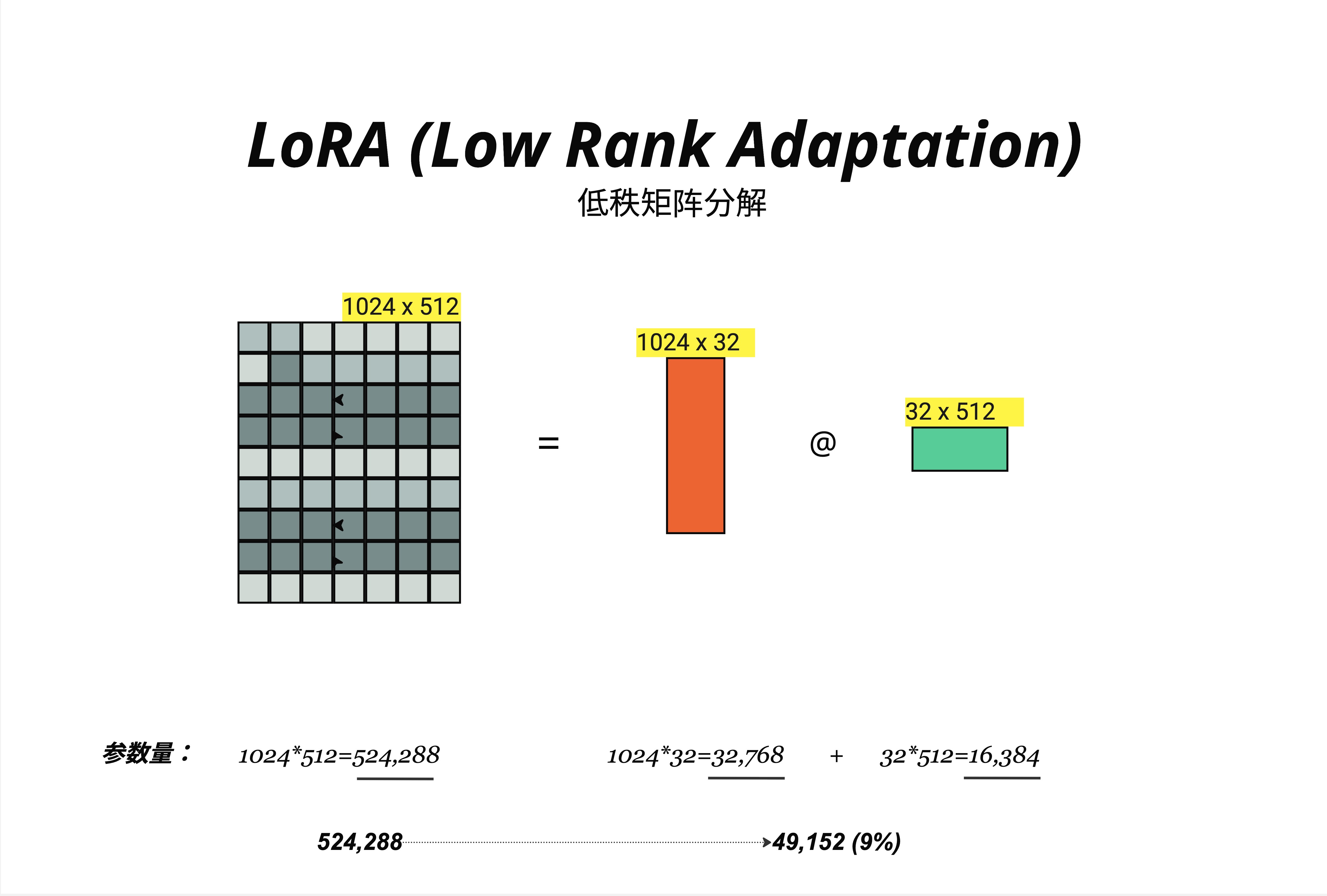 | LoRA | 低秩适应,只训练增量 | W = W_orig + B @ A |