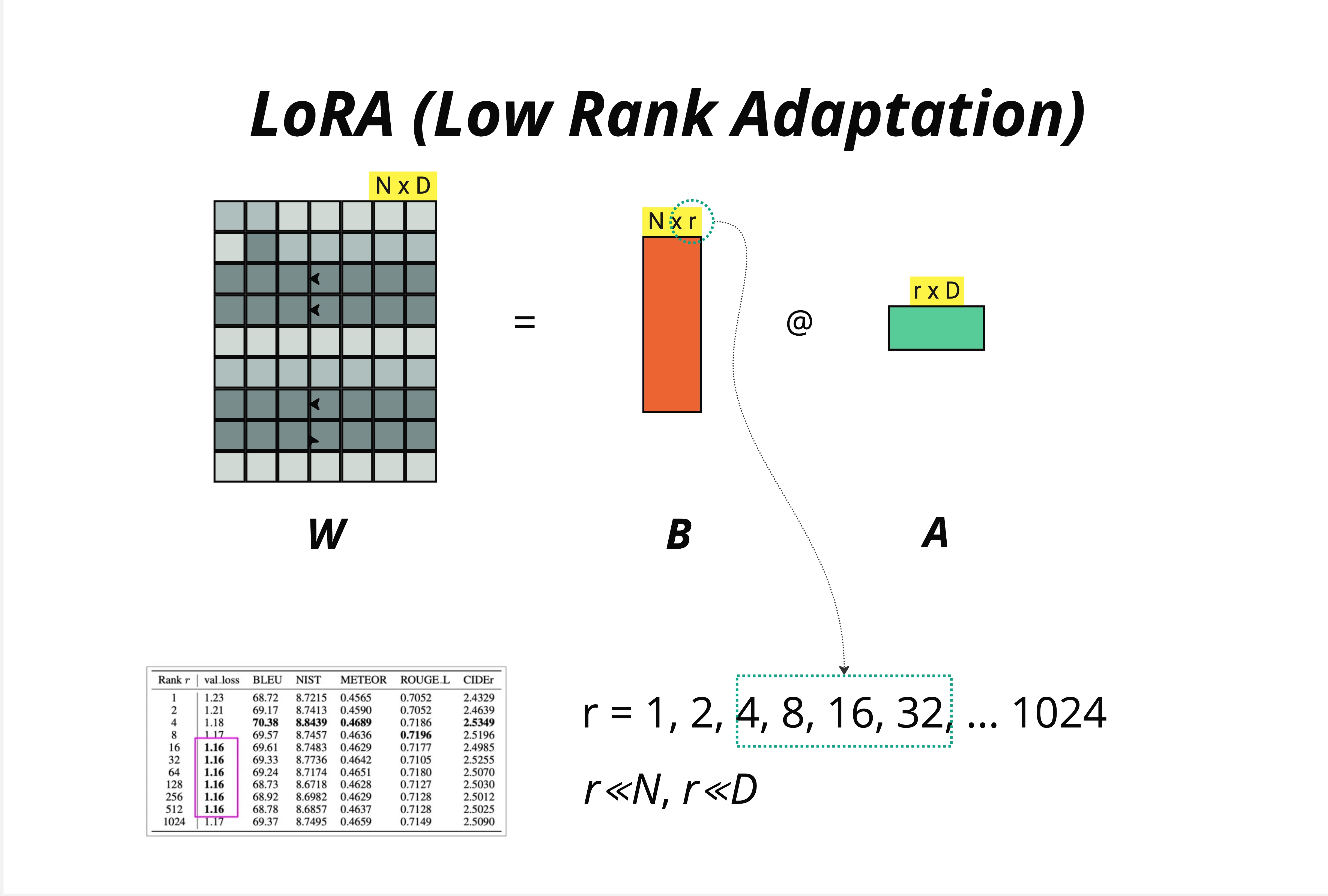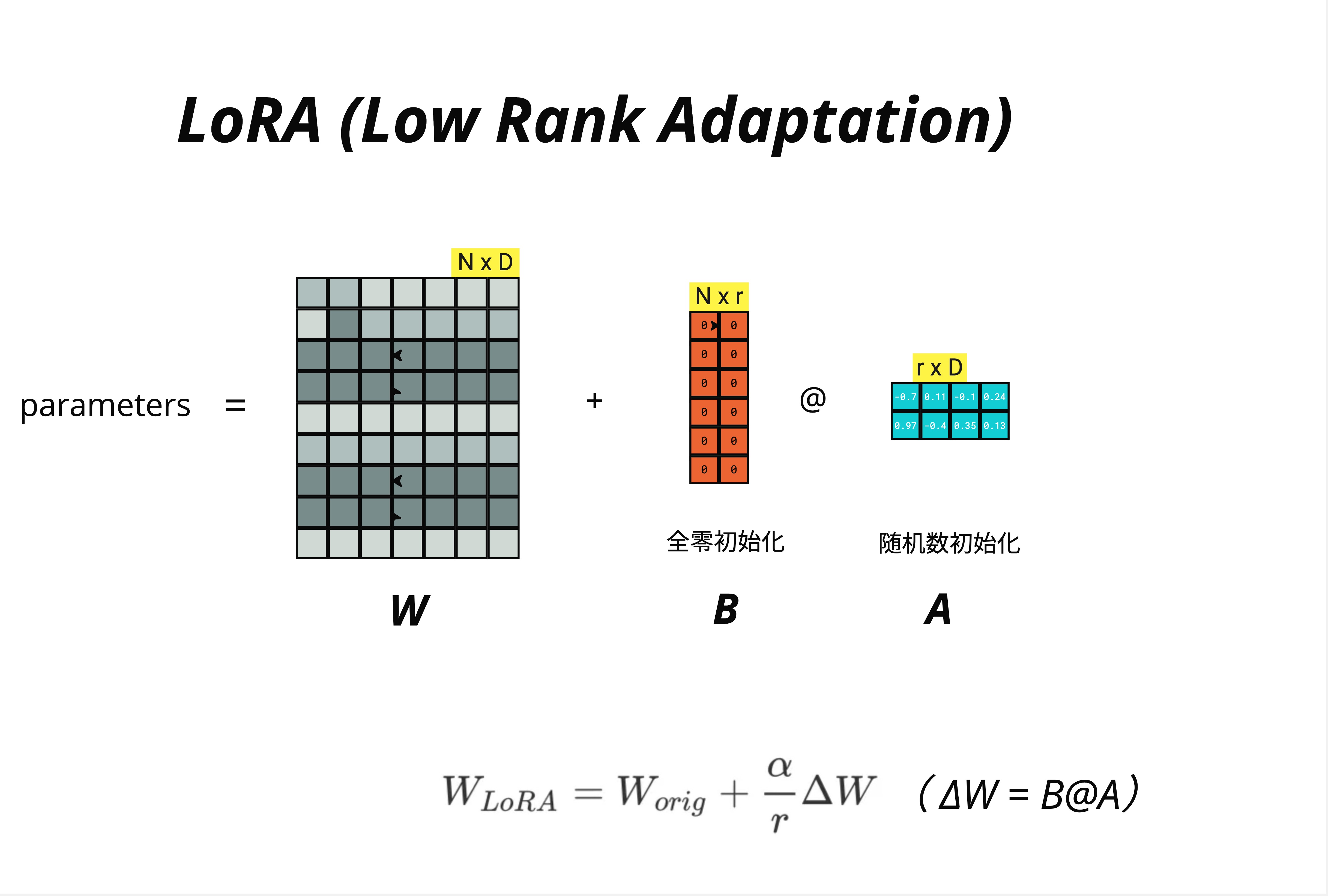 - LoRA 参数:N × r + r × D = r × (N + D)